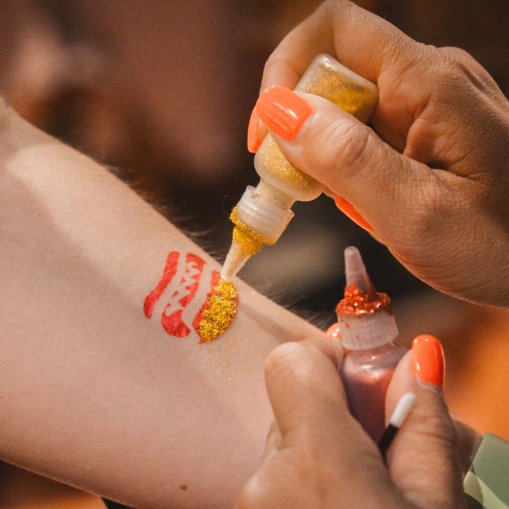 Our signature glitter tattoos? They’re the kind people don’t want to wash off. Waterproof, skin-safe, and packed with medical-grade sparkle. Designed to last and customized for your event with colors, logos, or themes. Guests light up when they get one, and they’ll be showing it off well after the party ends.